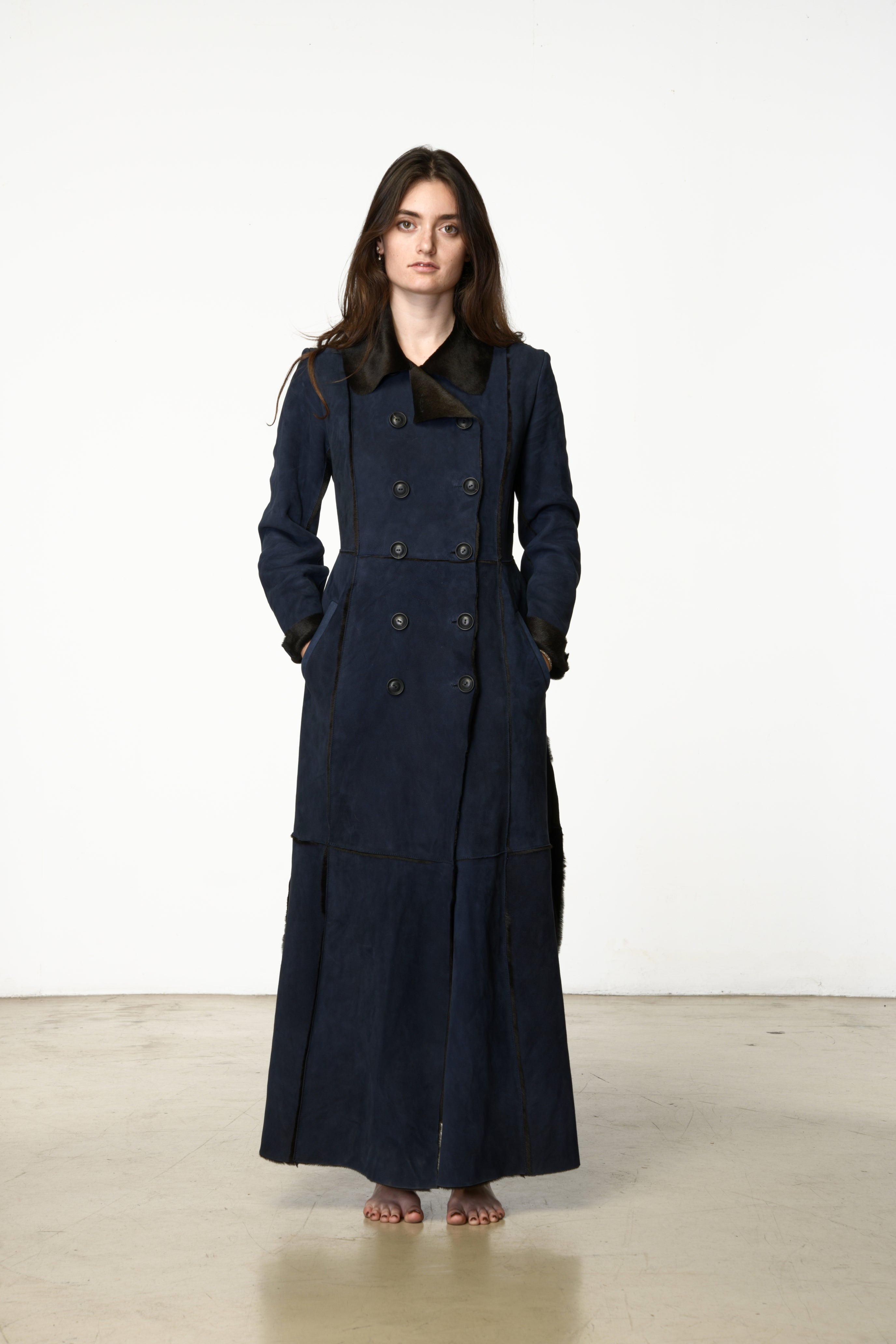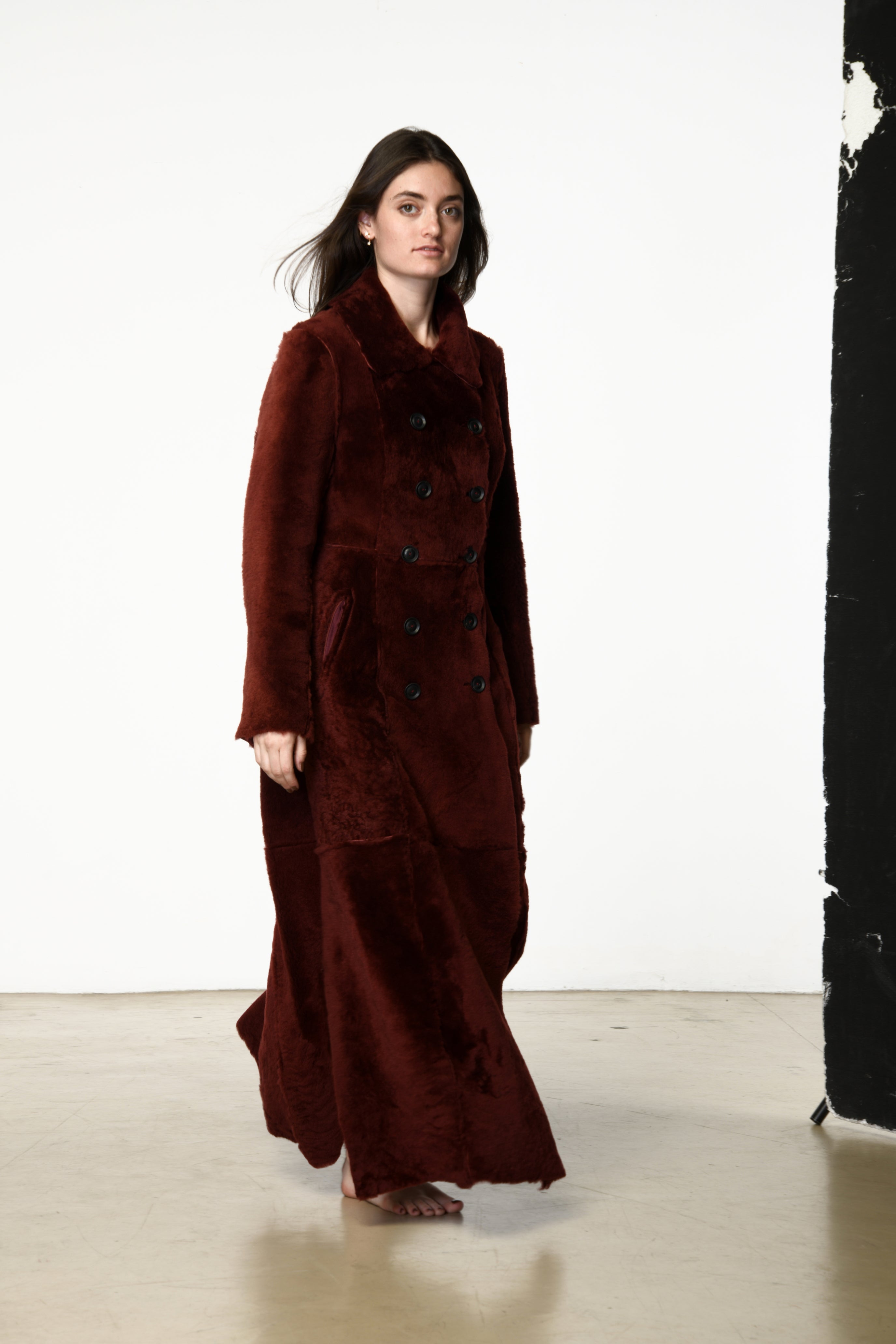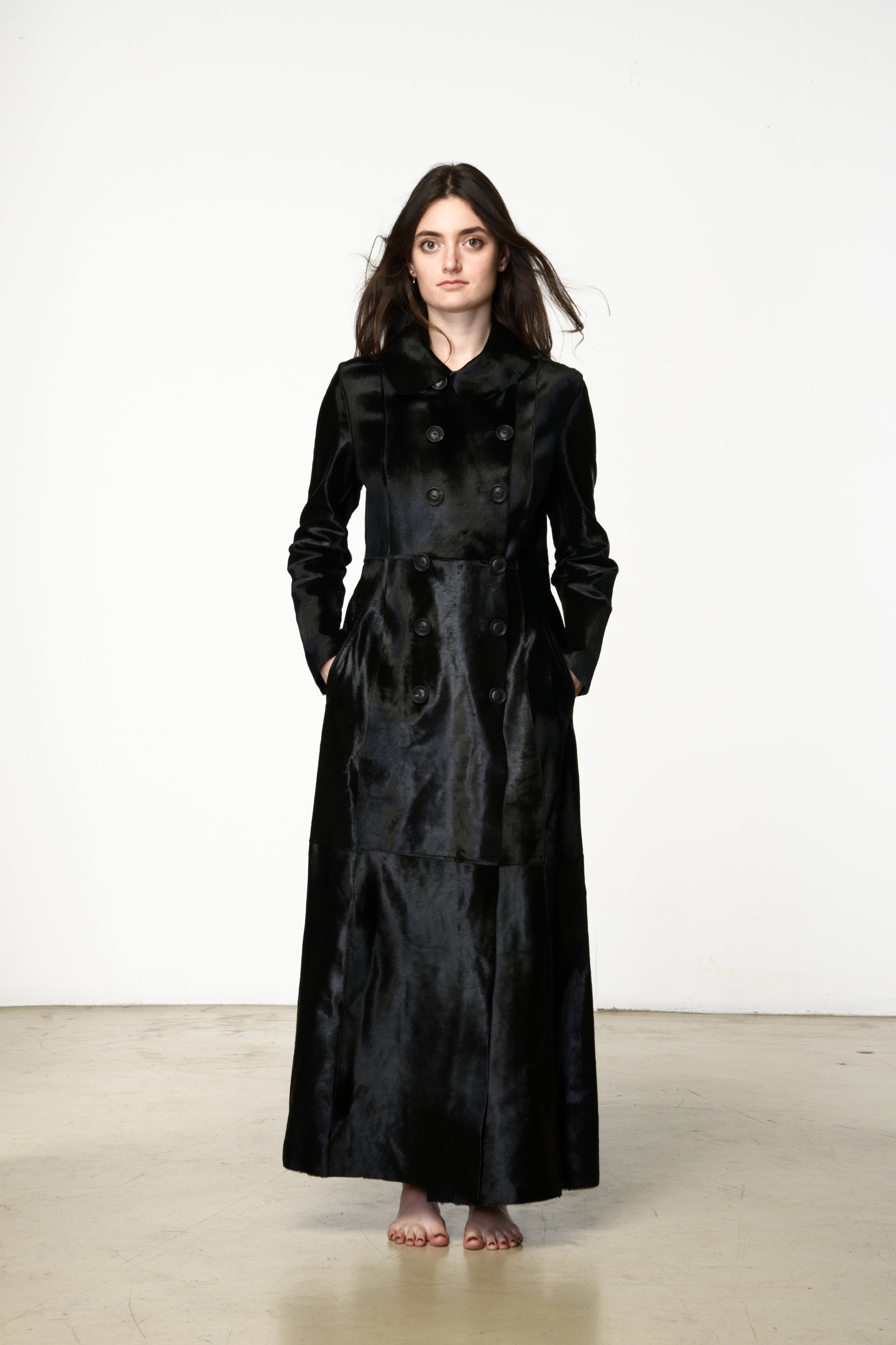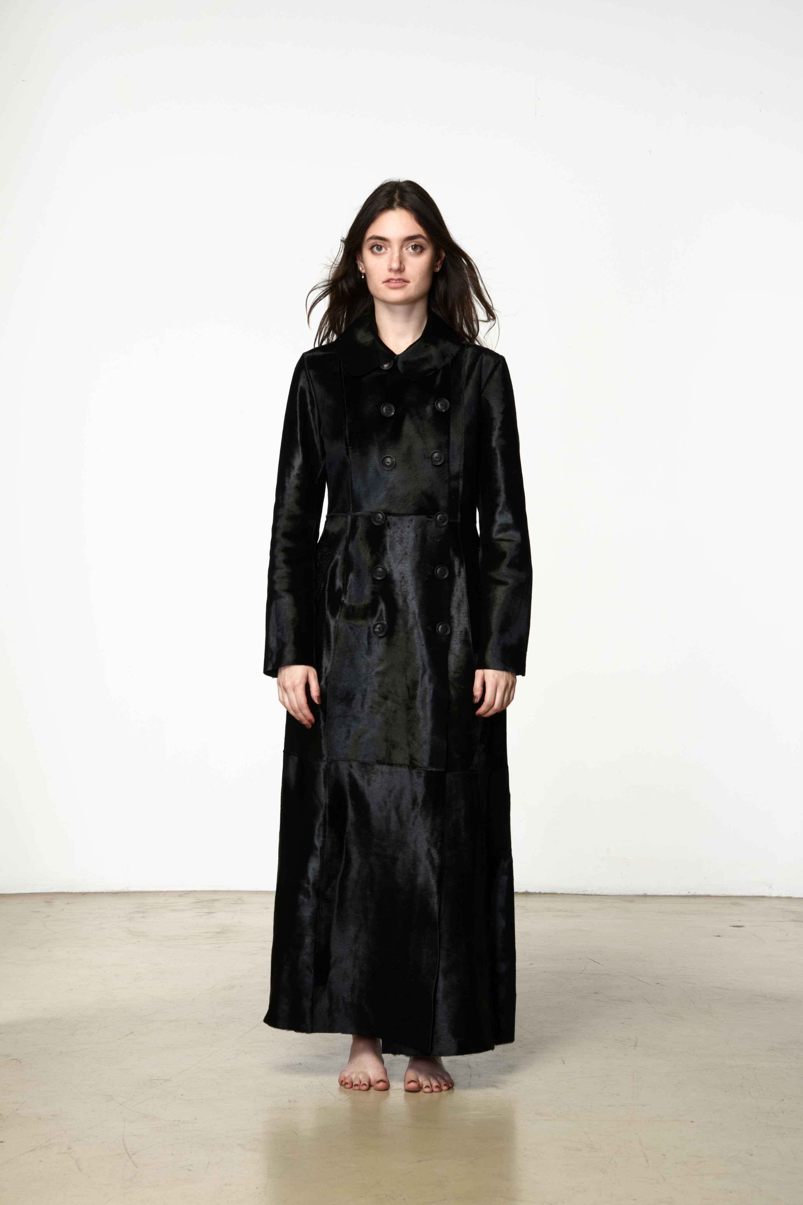 Double-breasted long coat with a sharp cut. A true statement piece, defined by clean proportions and timeless elegance, where sartorial construction meets the richness of the material.