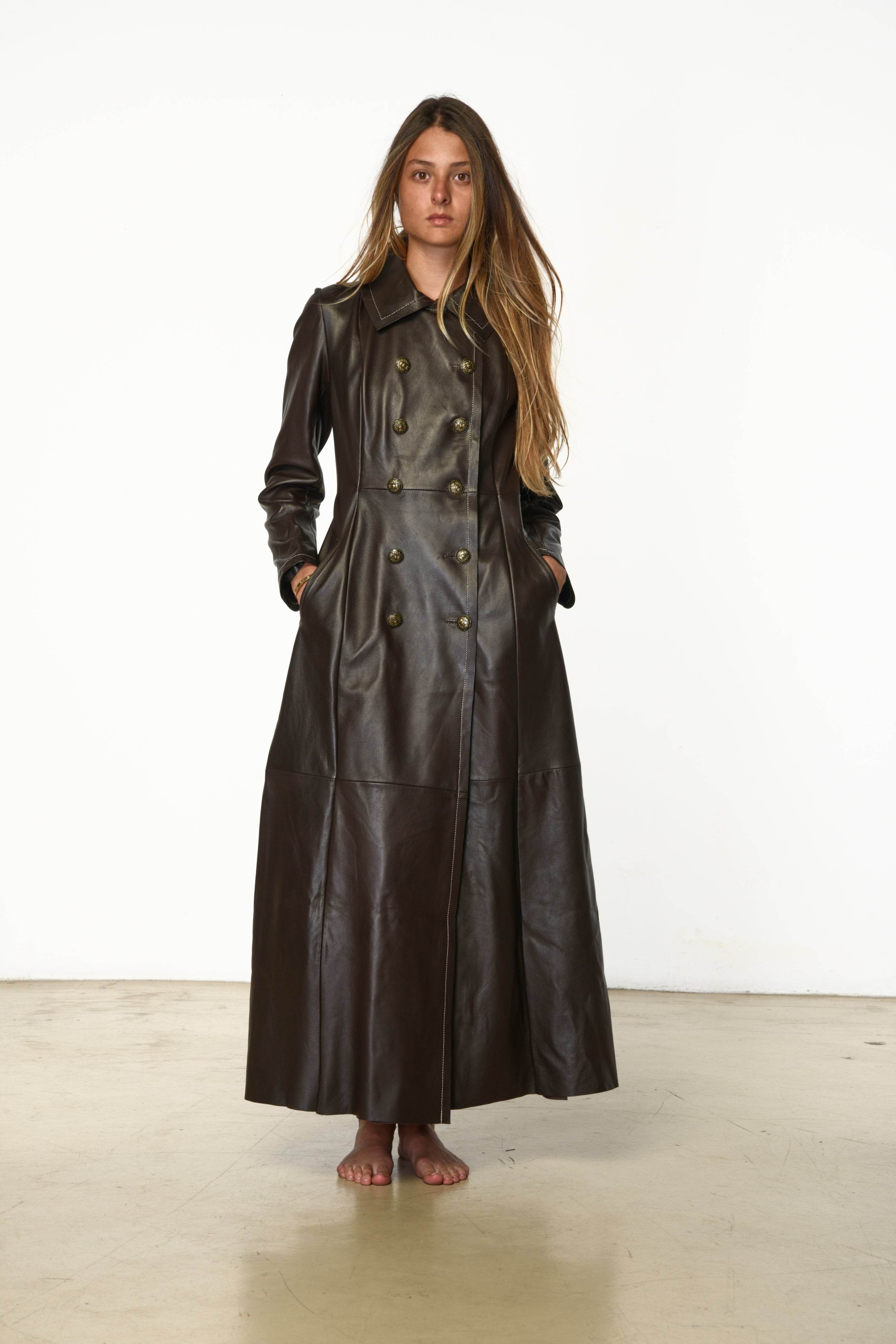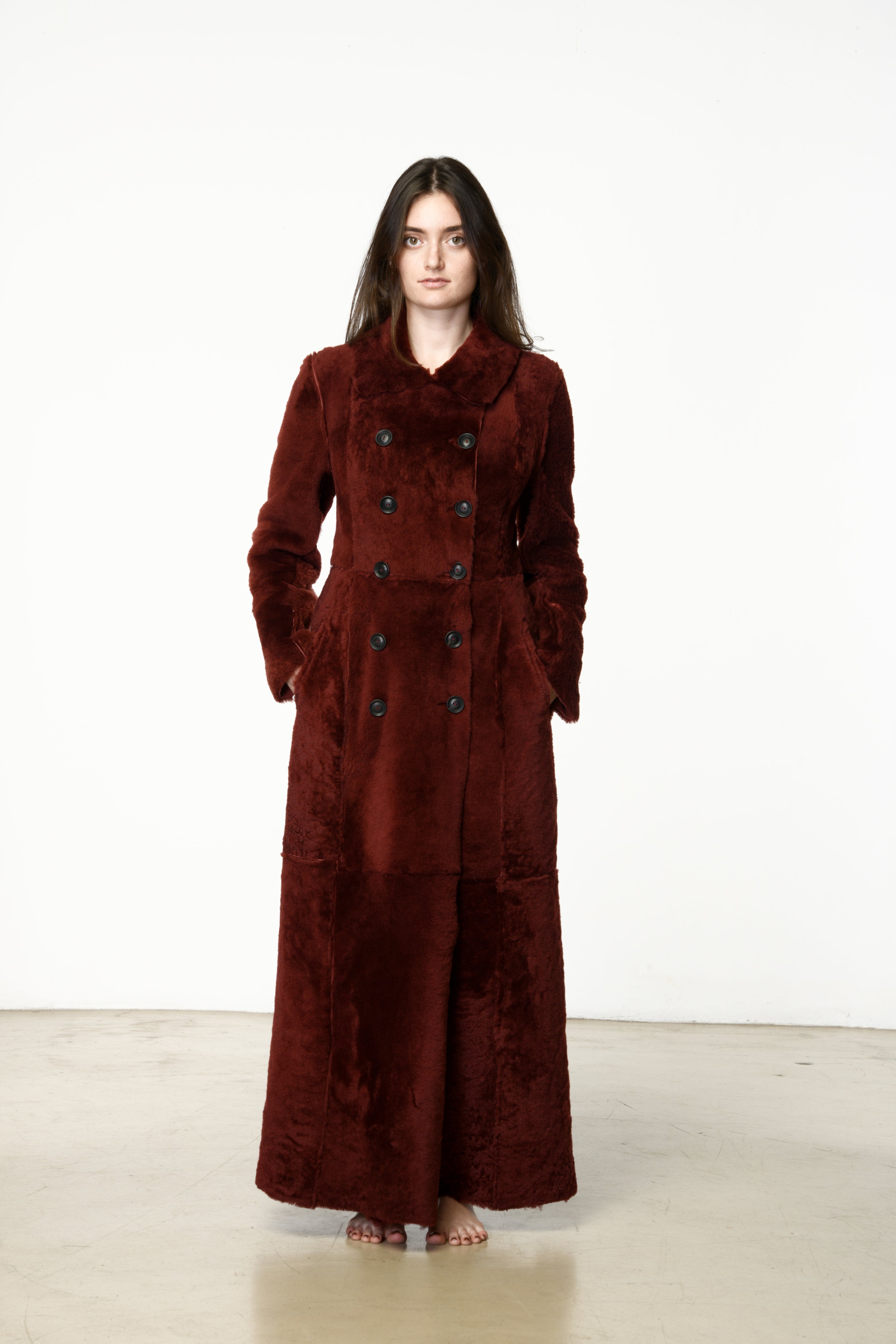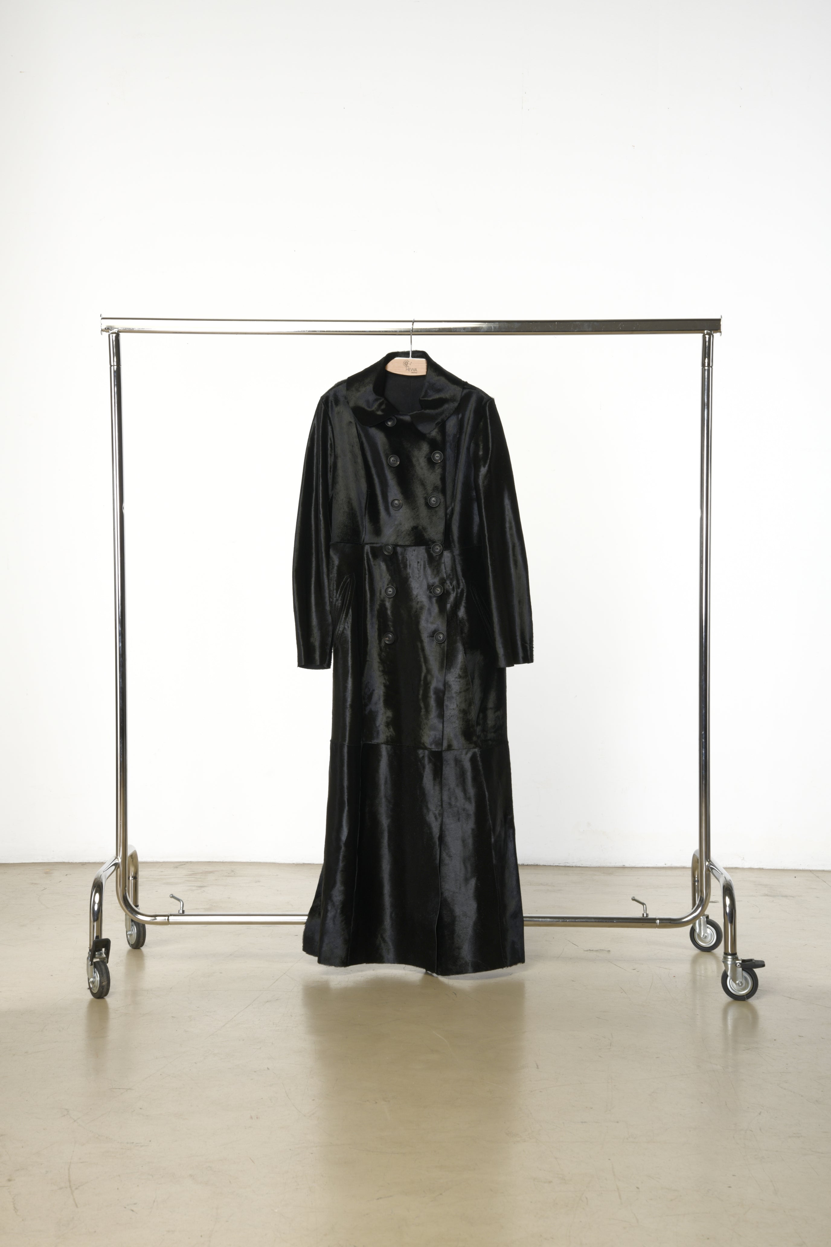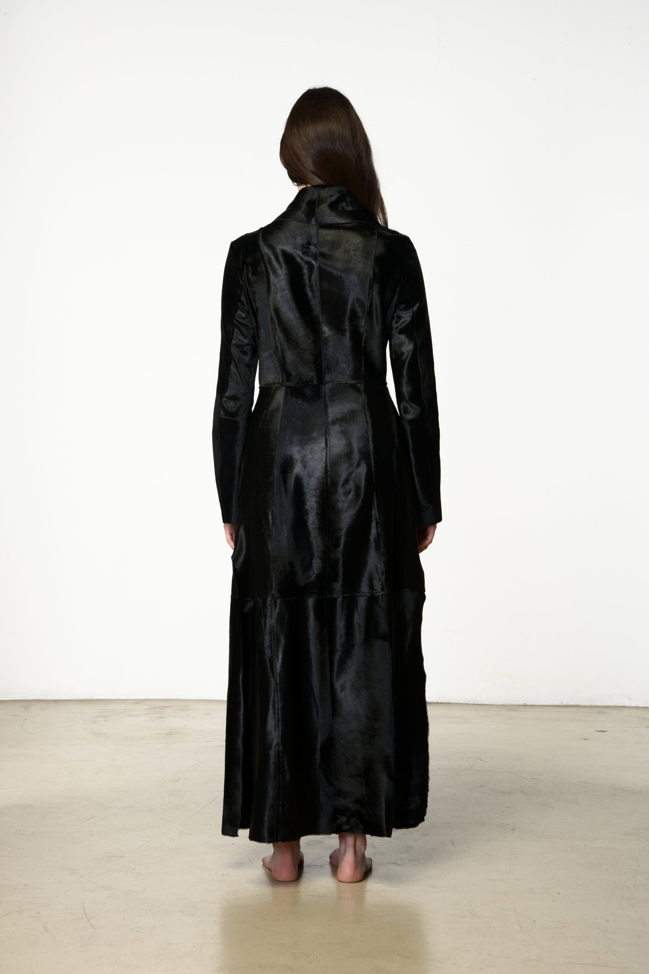 Double-breasted long coat with a sharp cut. A true statement piece, defined by clean proportions and timeless elegance, where sartorial construction meets the richness of the material.