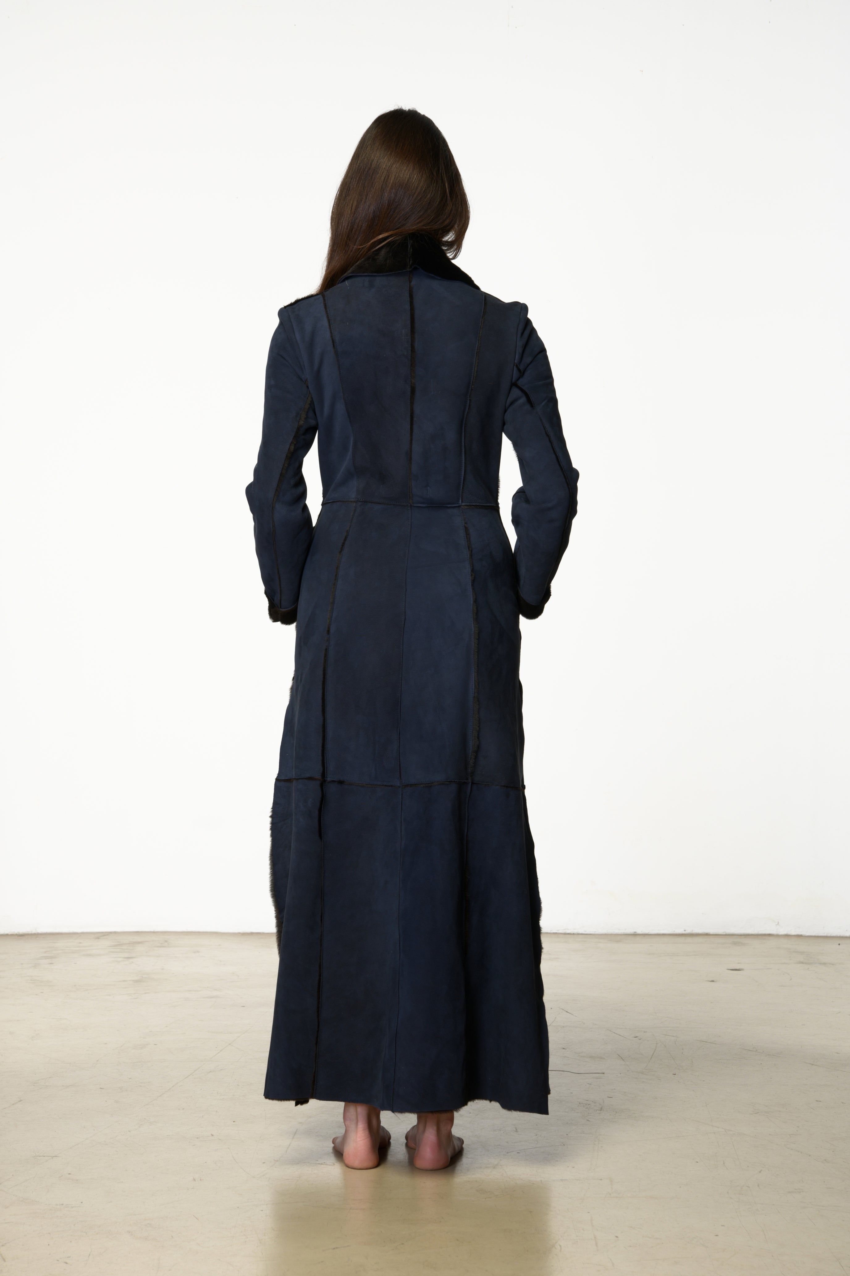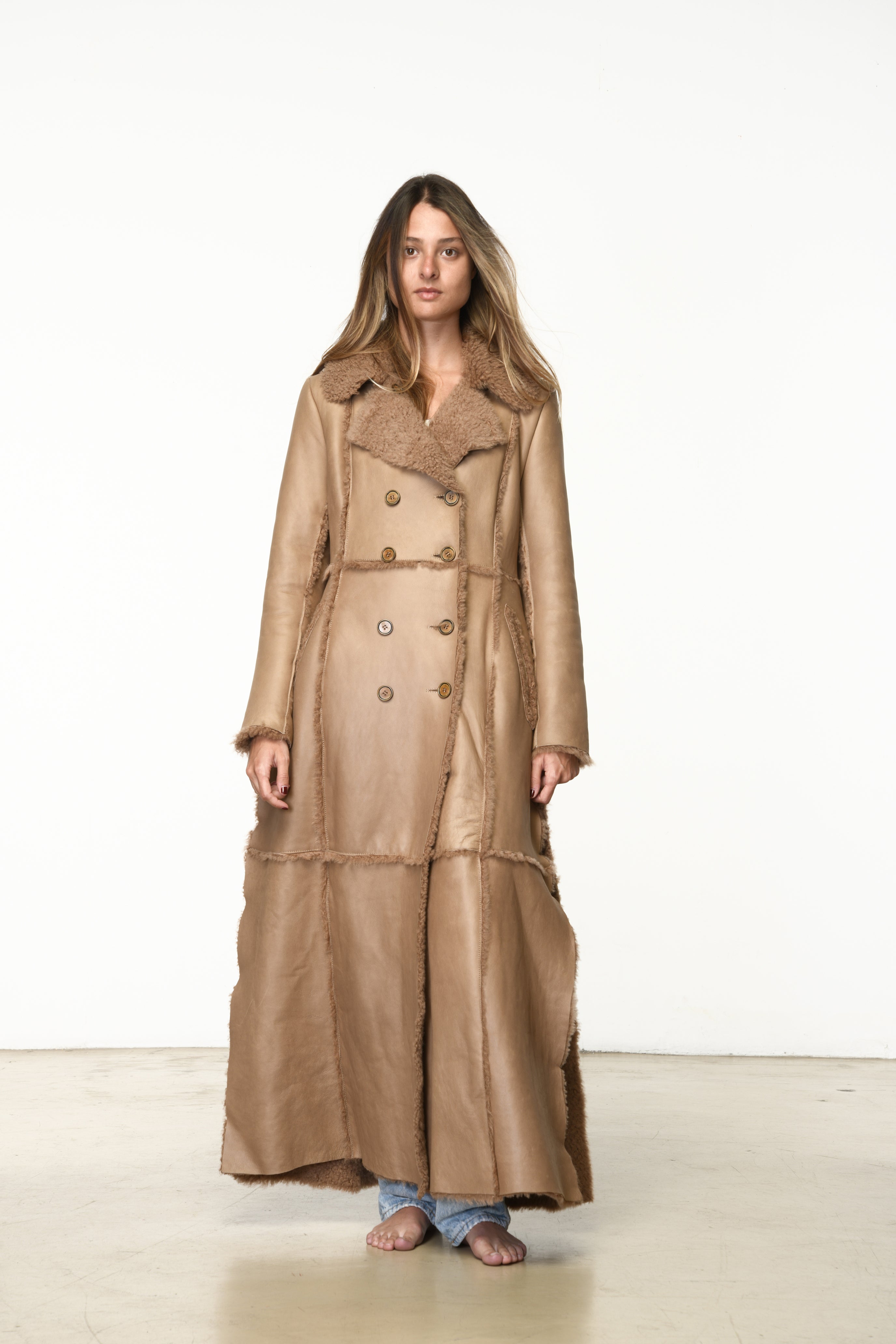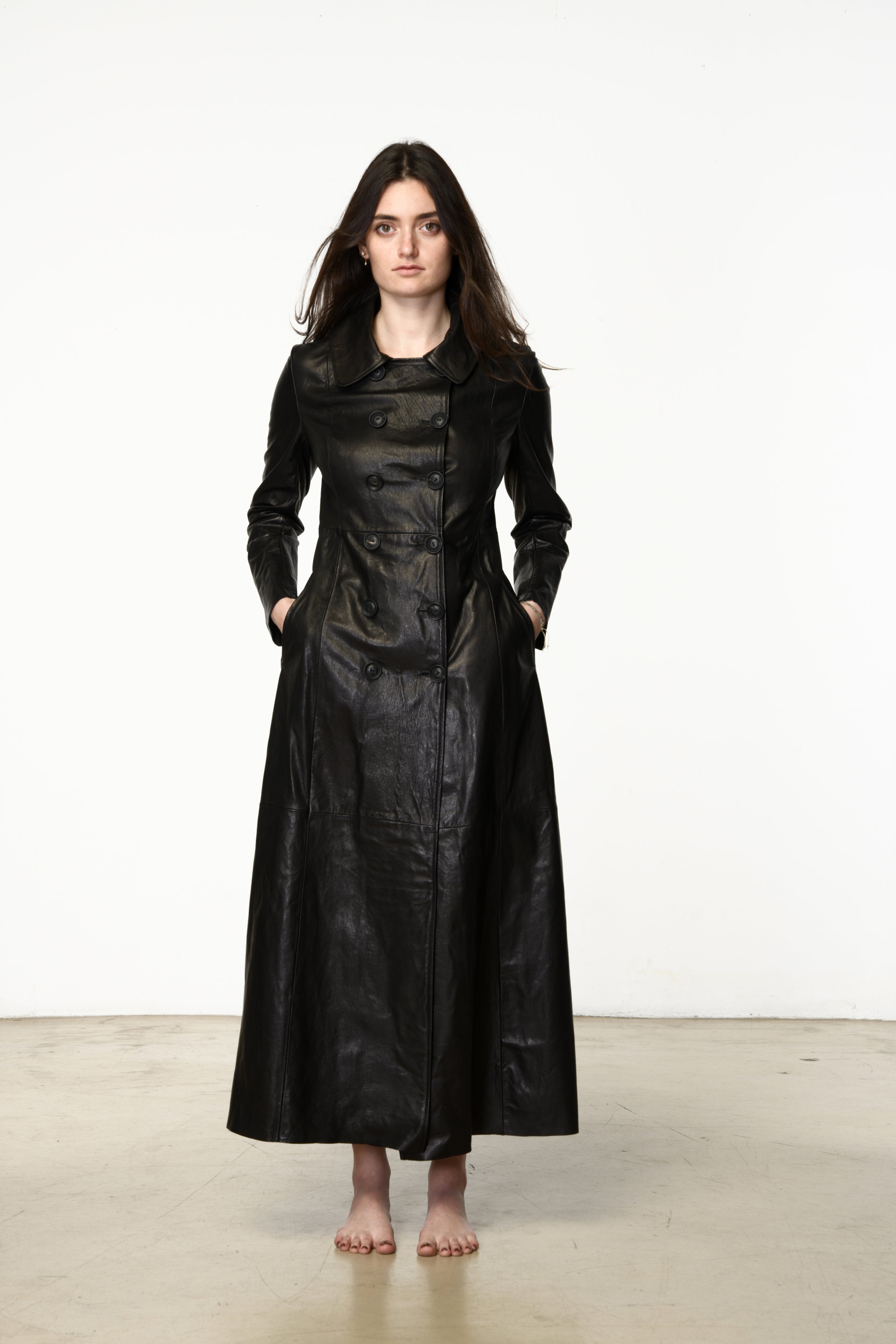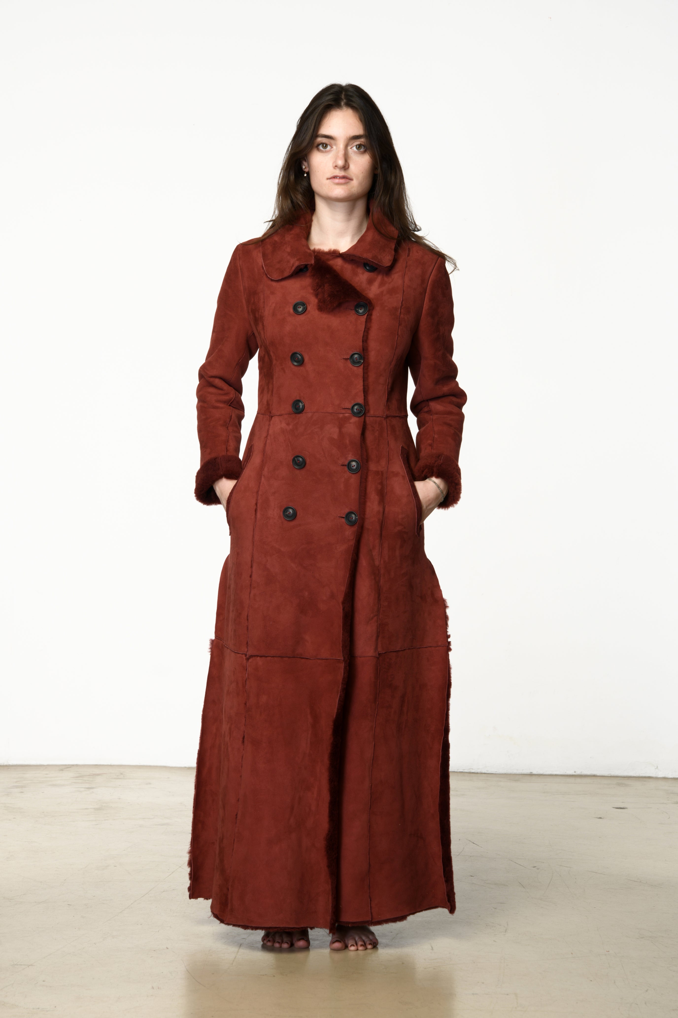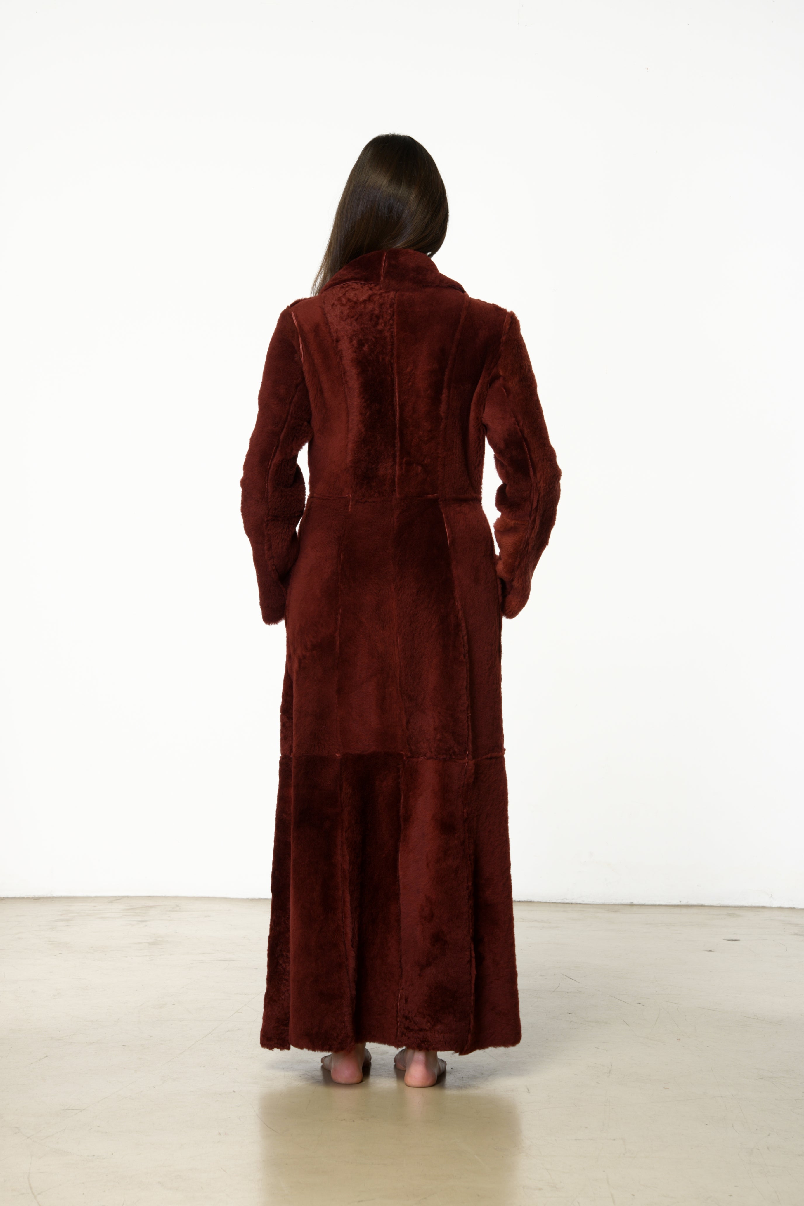 Double-breasted long coat with a sharp cut. A true statement piece, defined by clean proportions and timeless elegance, where sartorial construction meets the richness of the material.