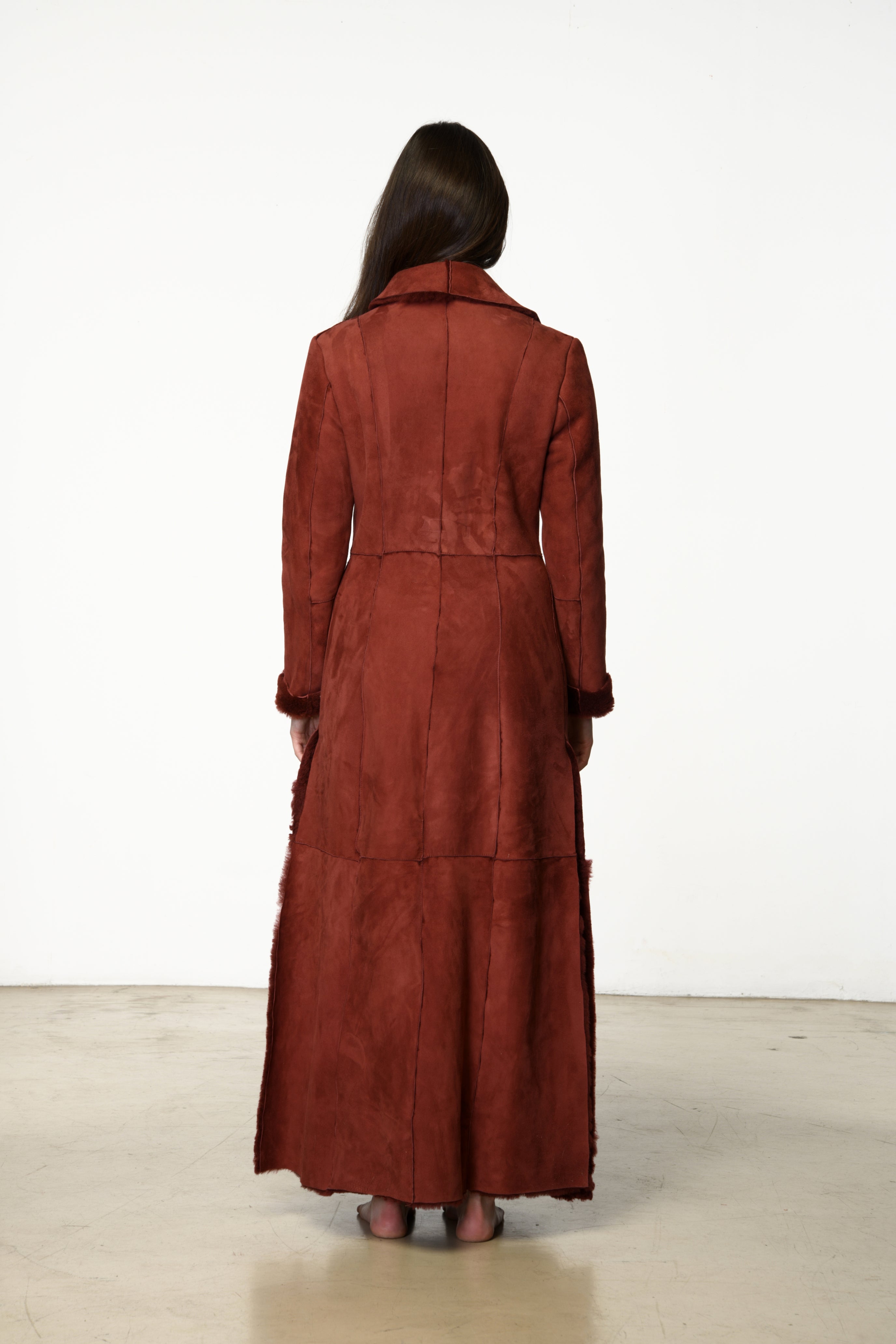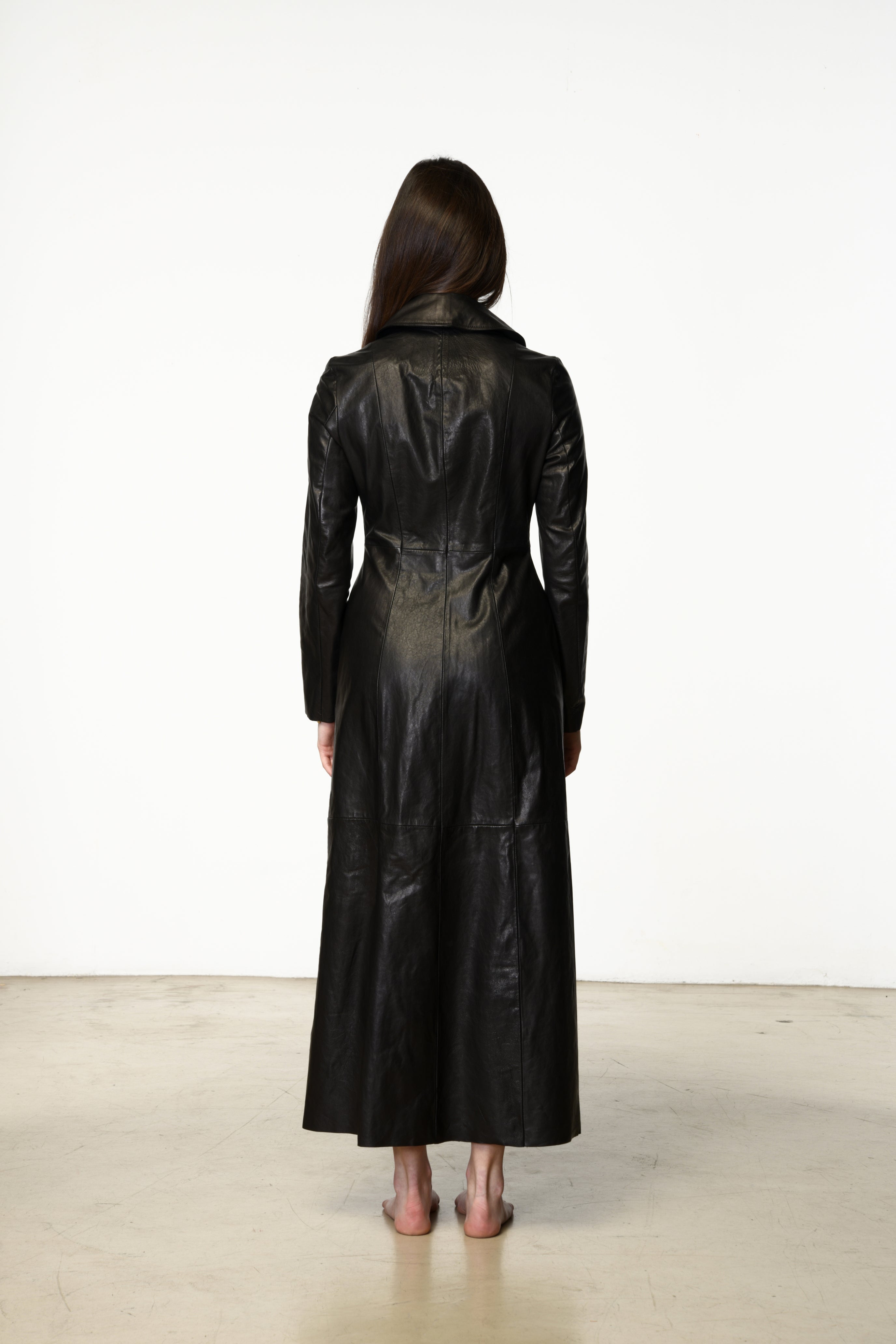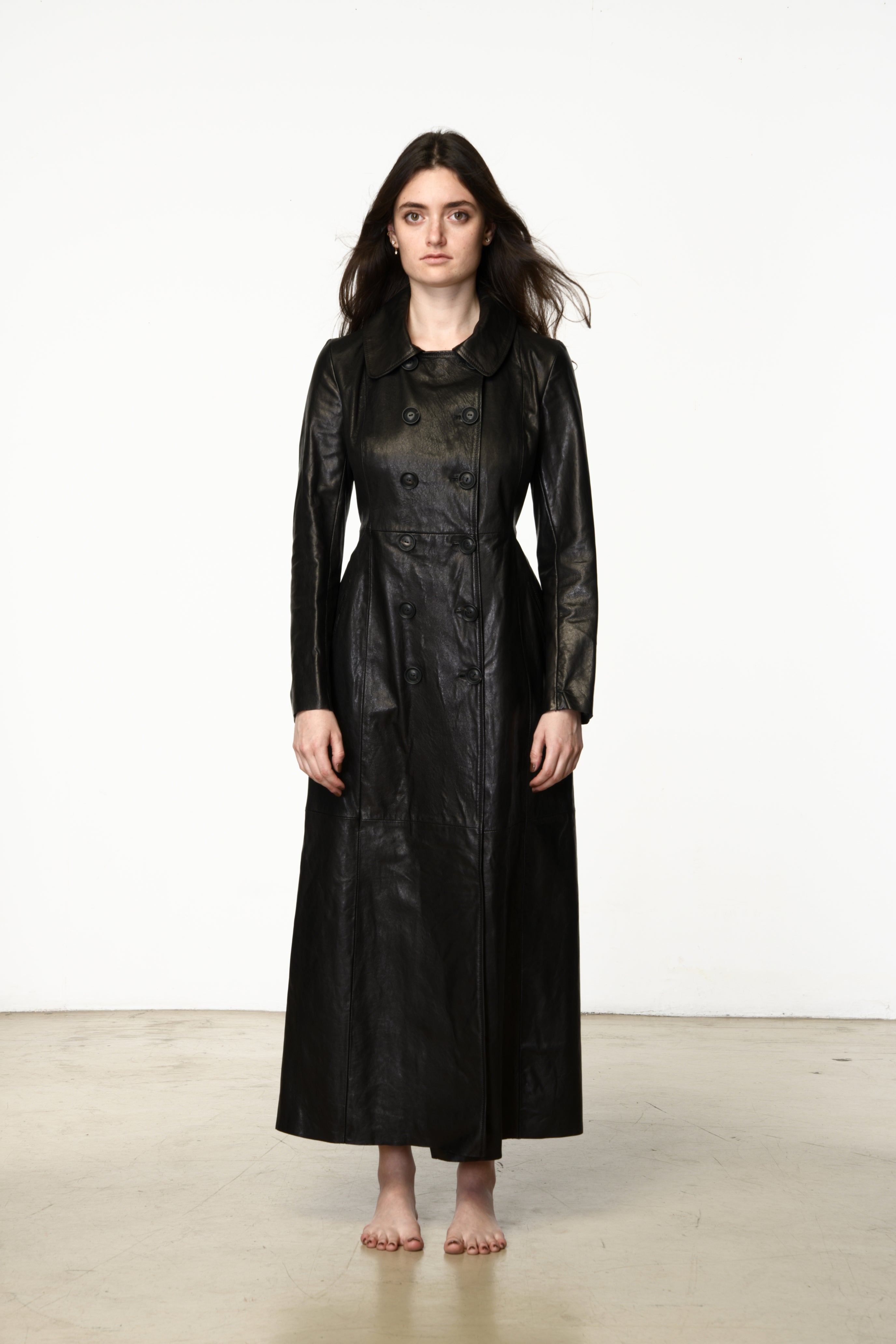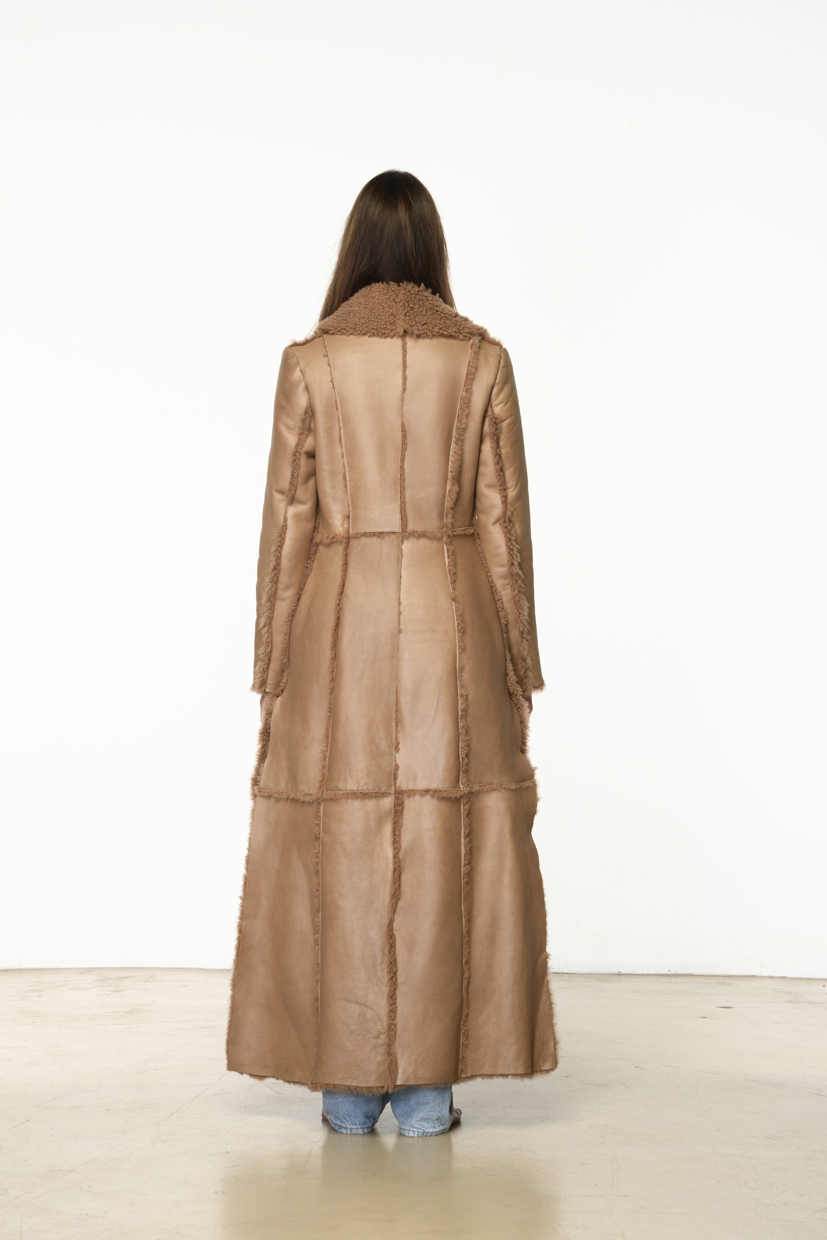 Double-breasted long coat with a sharp cut. A true statement piece, defined by clean proportions and timeless elegance, where sartorial construction meets the richness of the material.