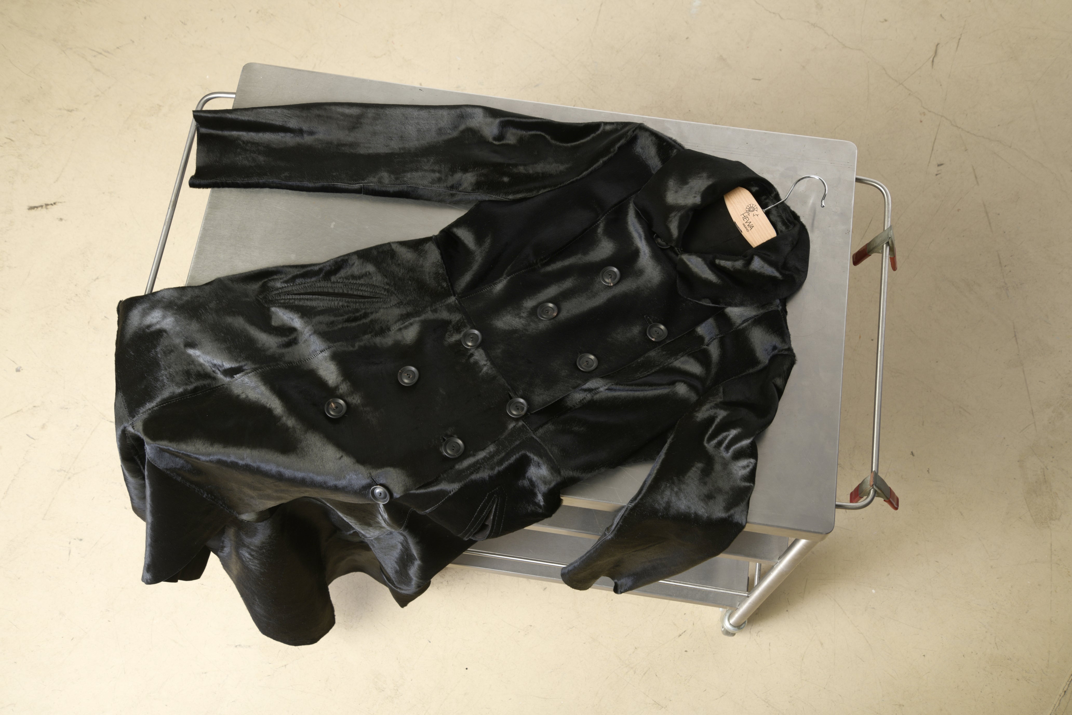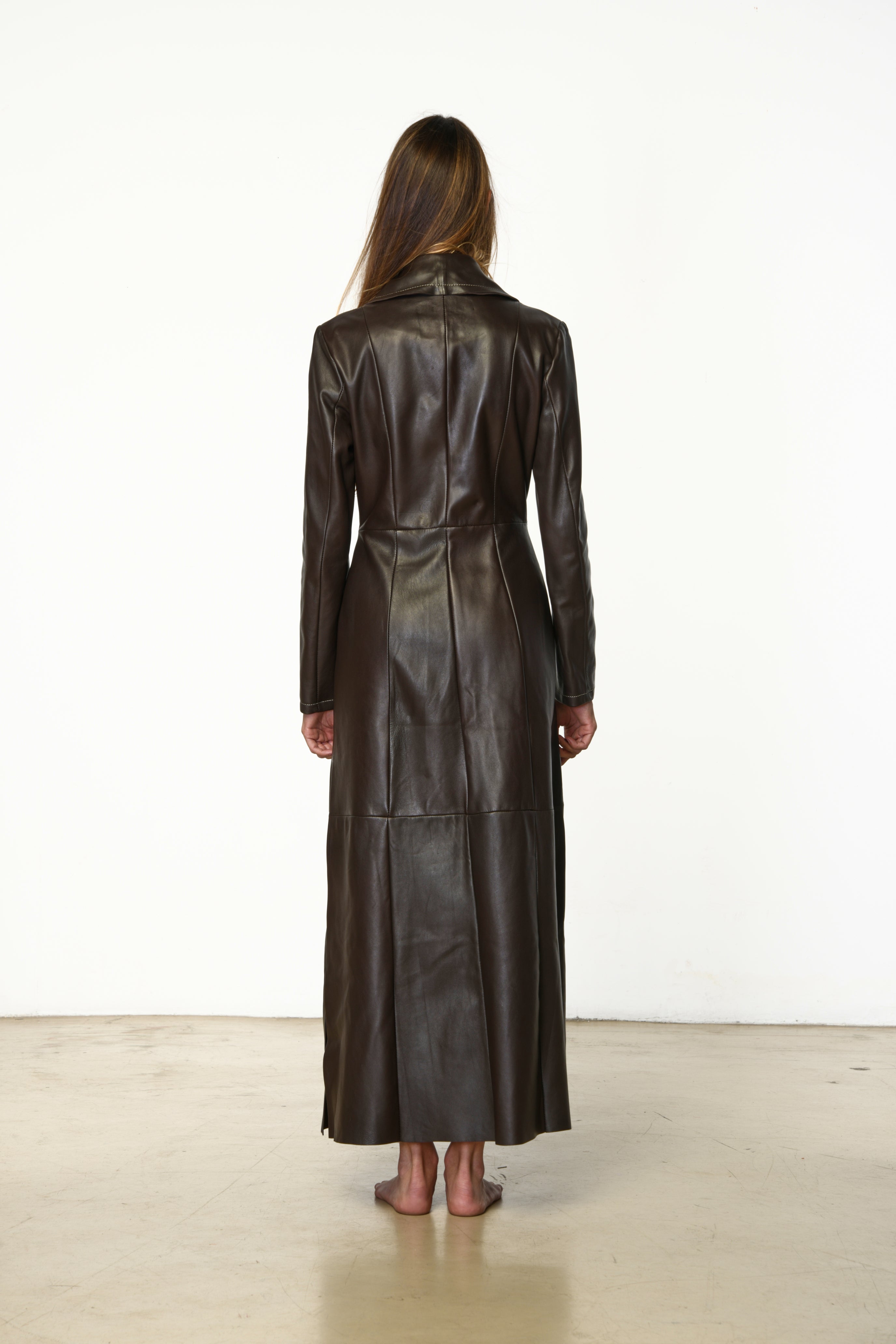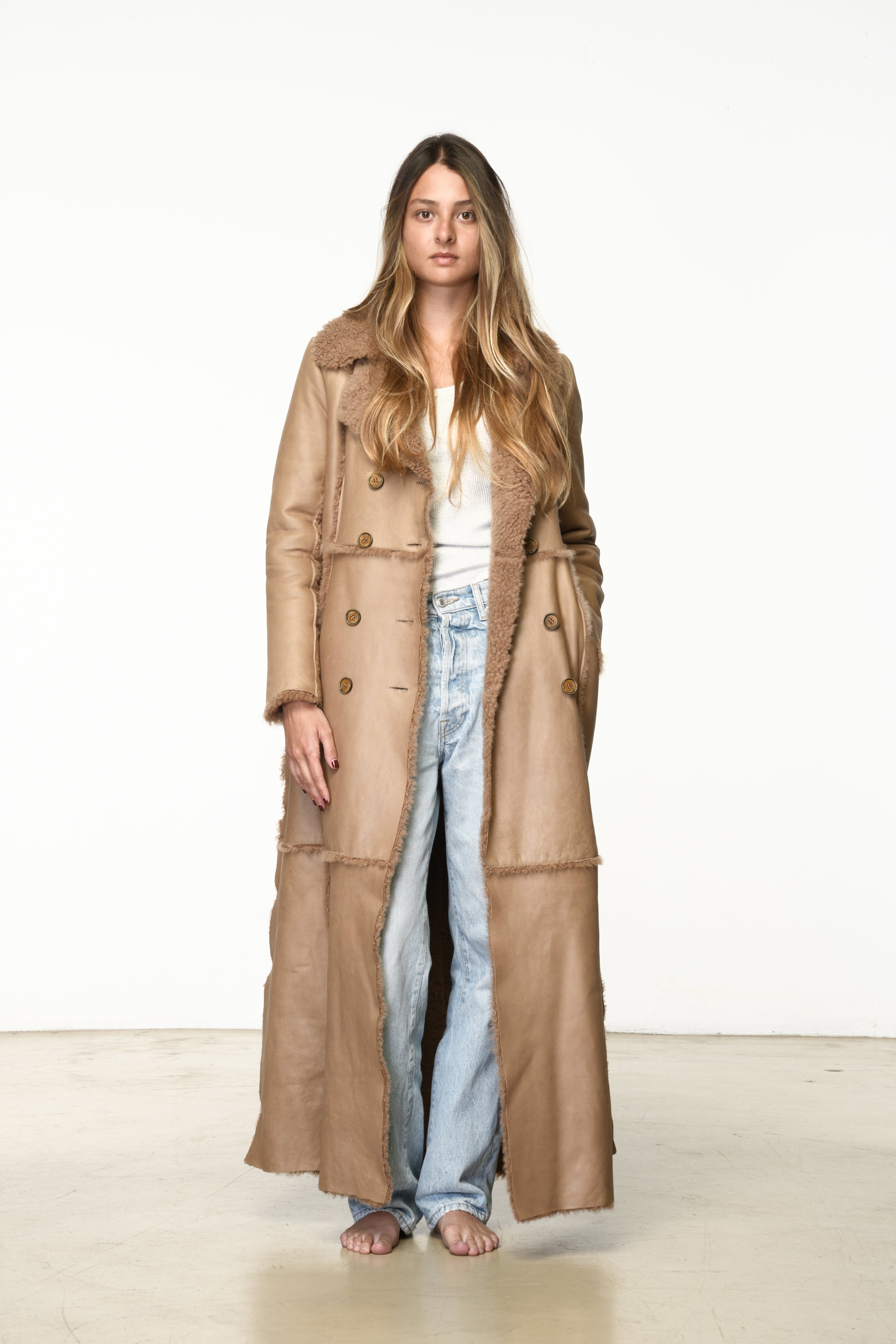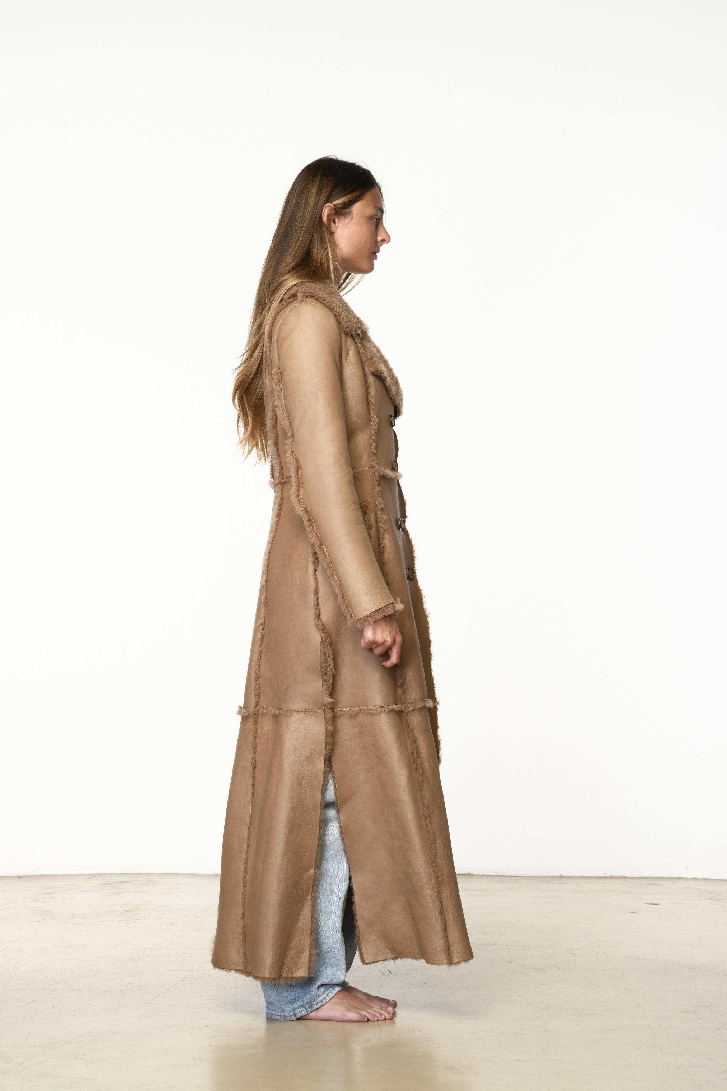 Double-breasted long coat with a sharp cut. A true statement piece, defined by clean proportions and timeless elegance, where sartorial construction meets the richness of the material.