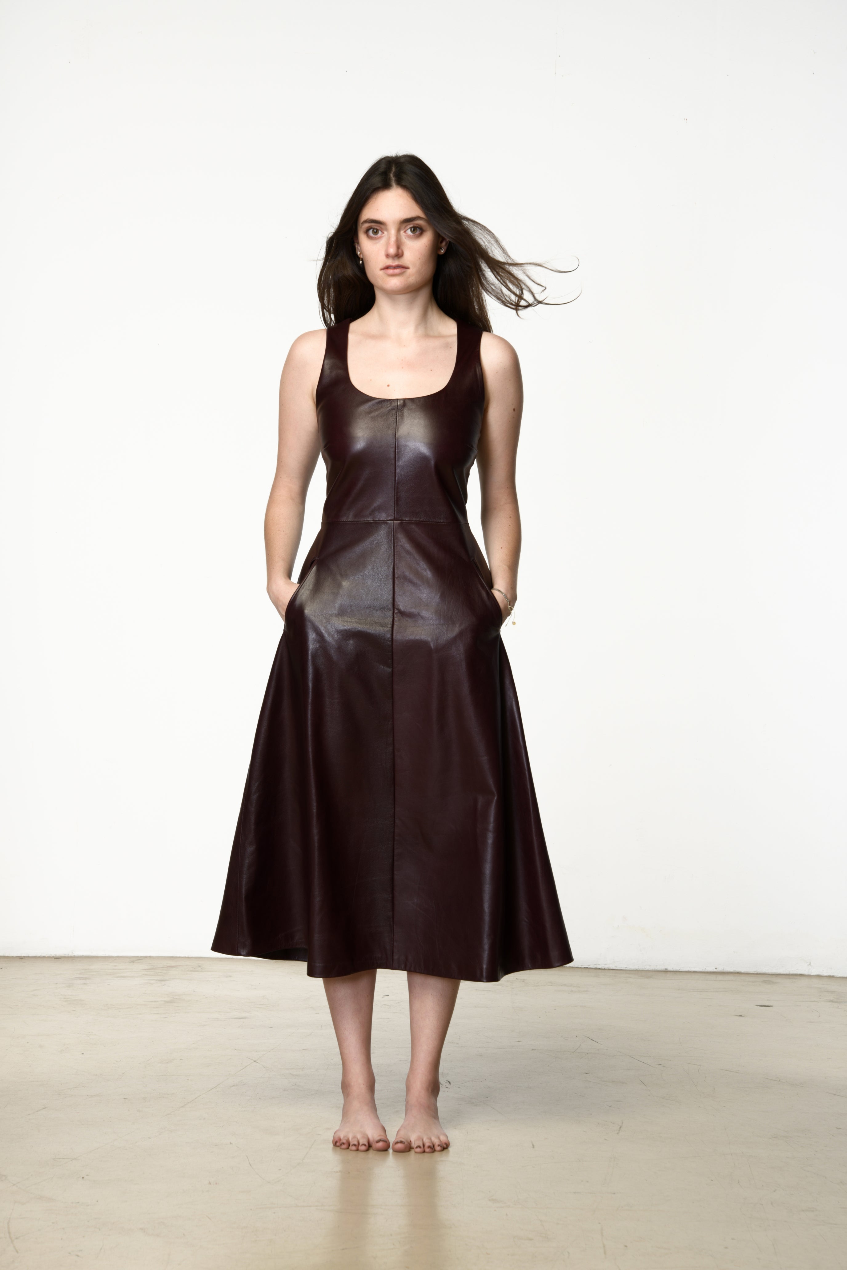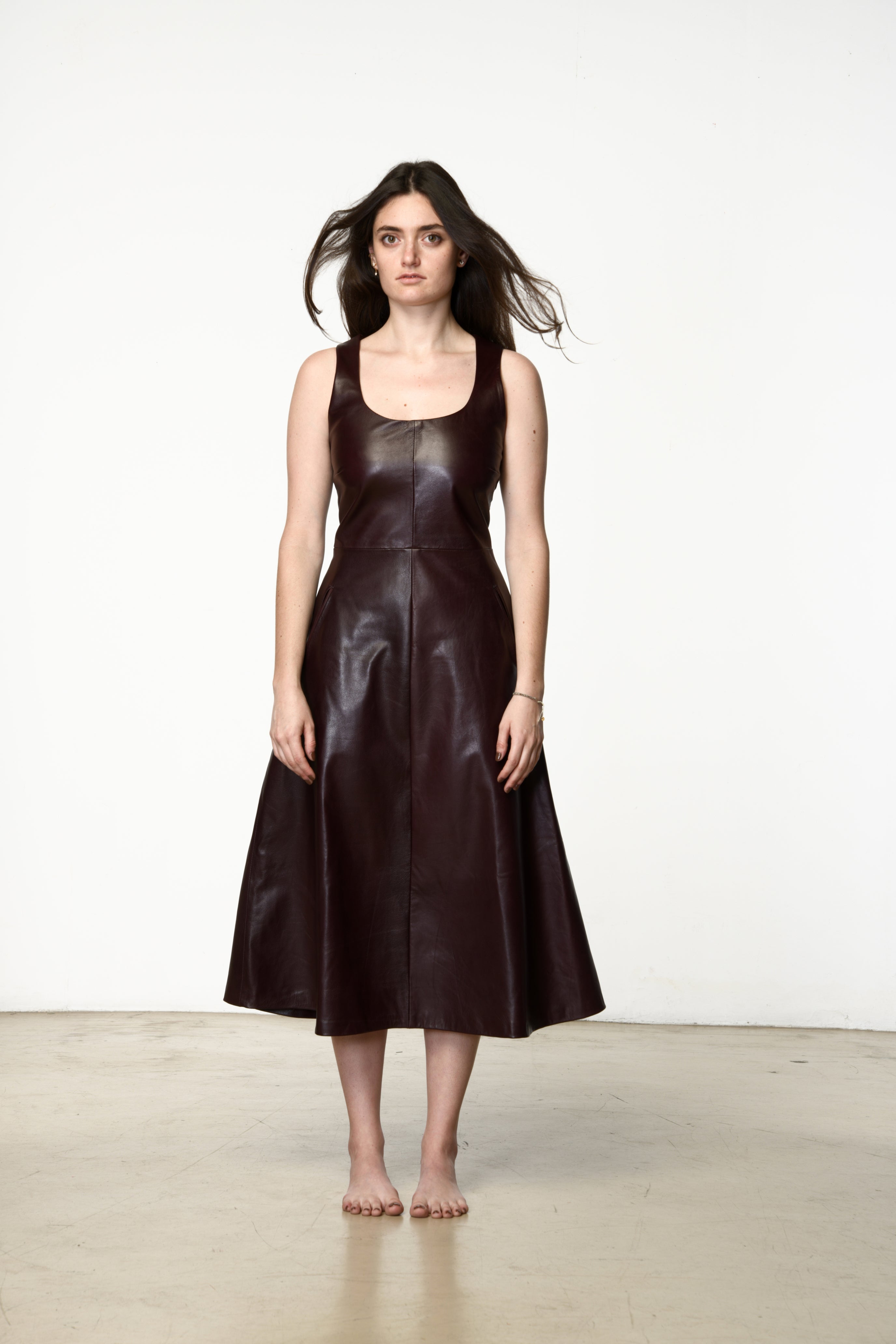 Nappa leather midi dress featuring a sleek square neckline, fitted waist, and flared skirt. Effortless elegance, made for every day.