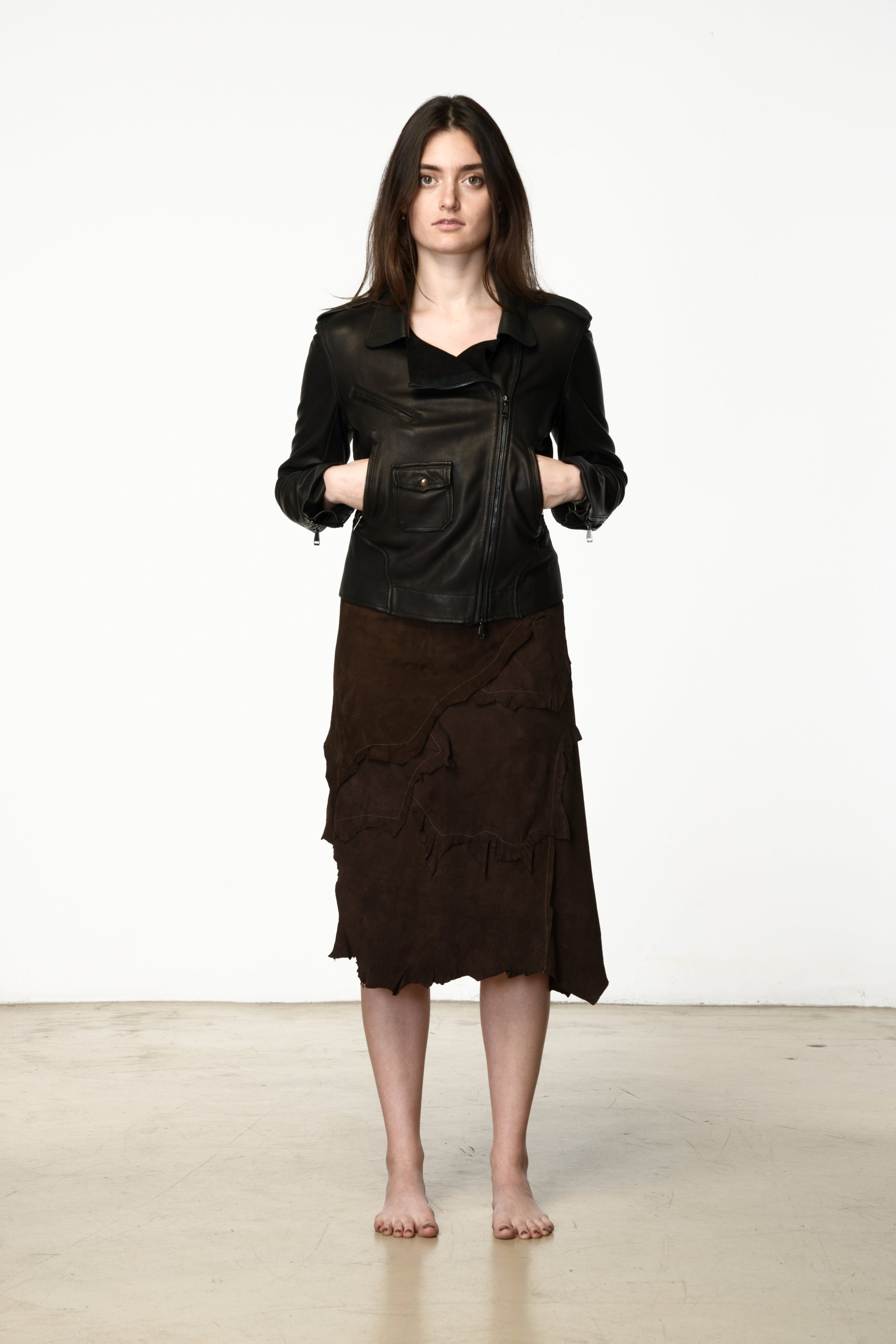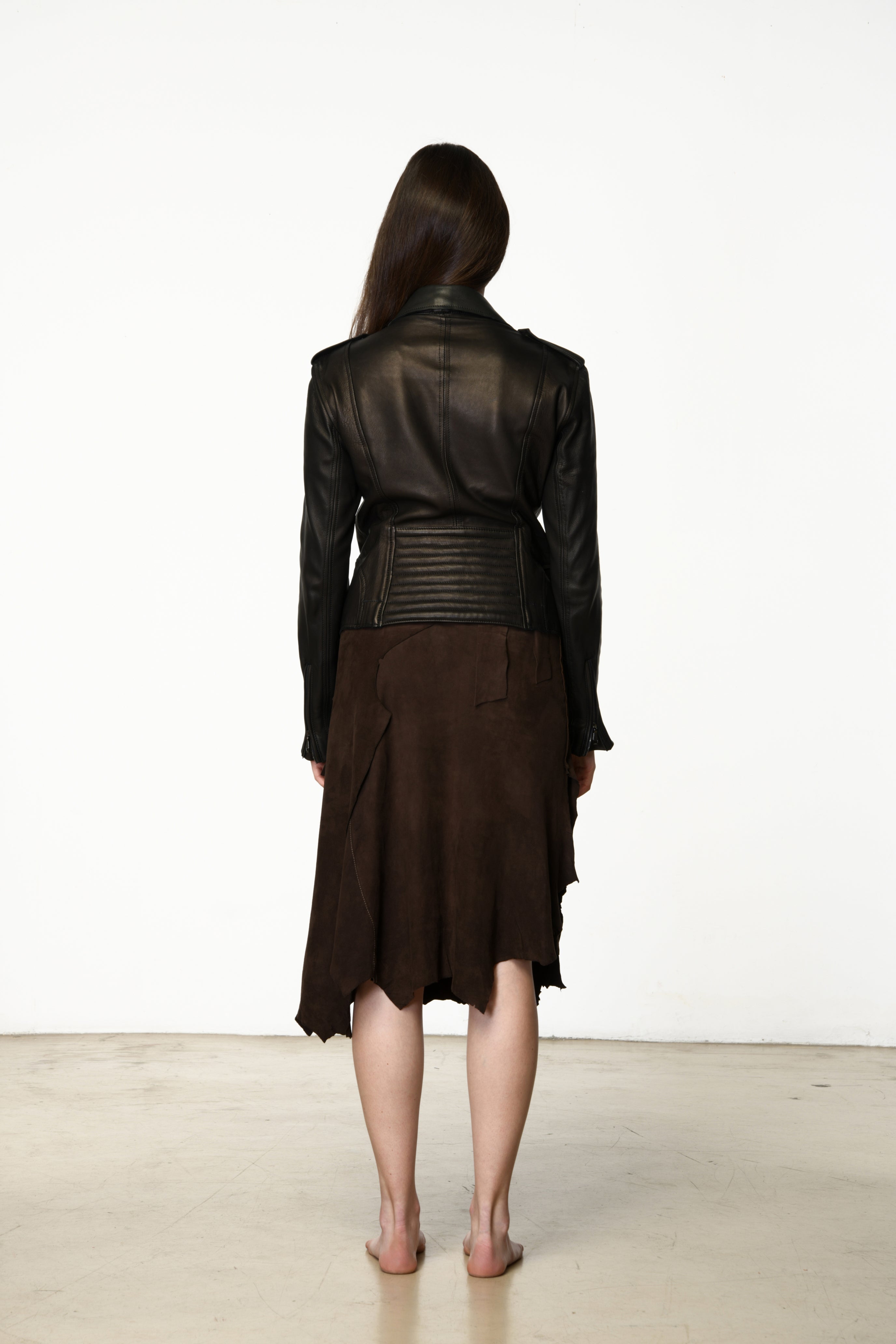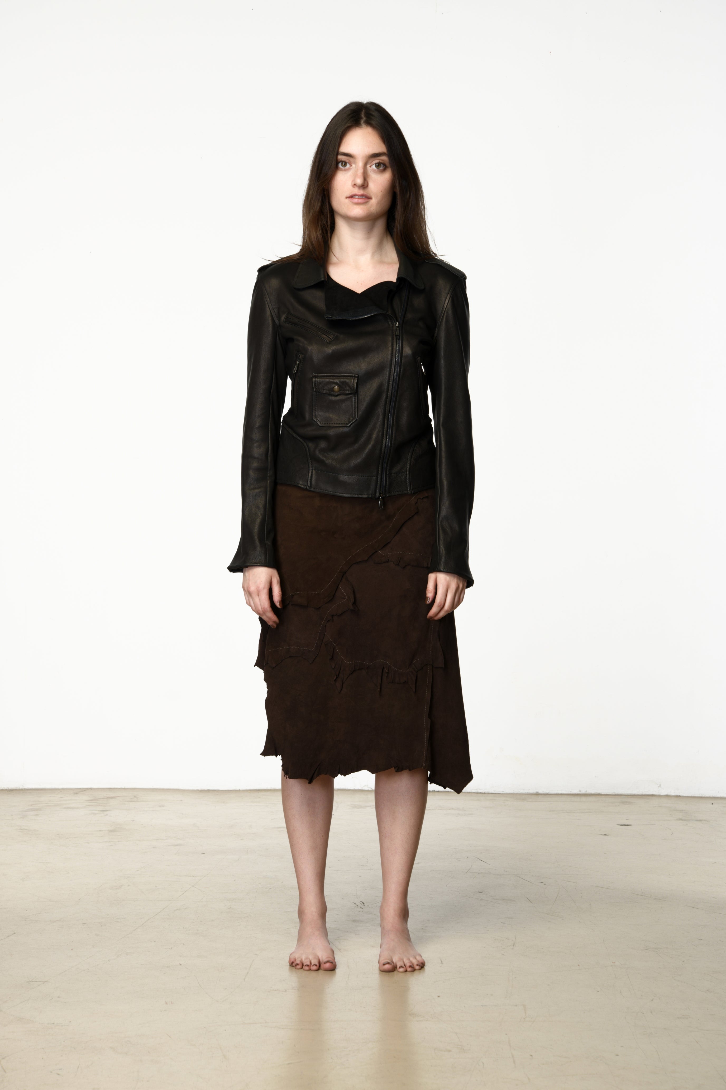 Midi suede skirt with patchwork construction and raw edges, blending bohemian and western style.
