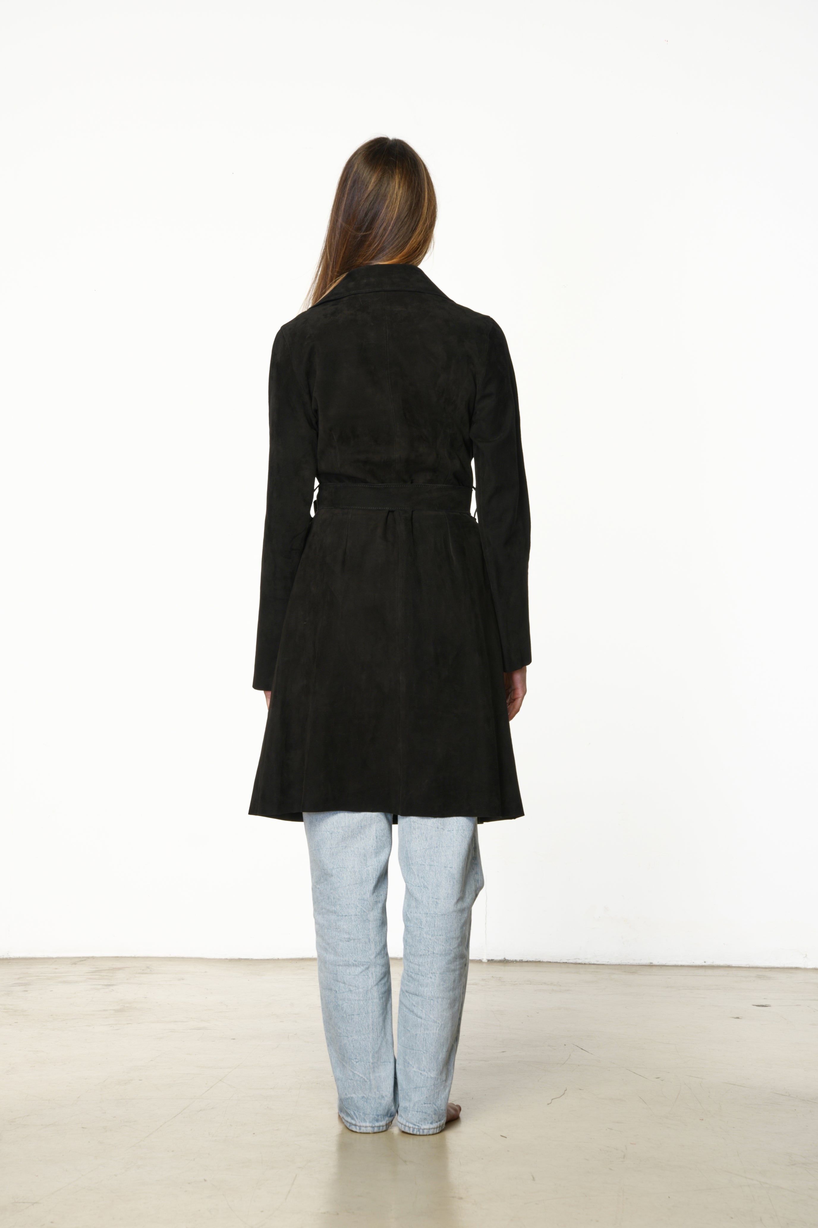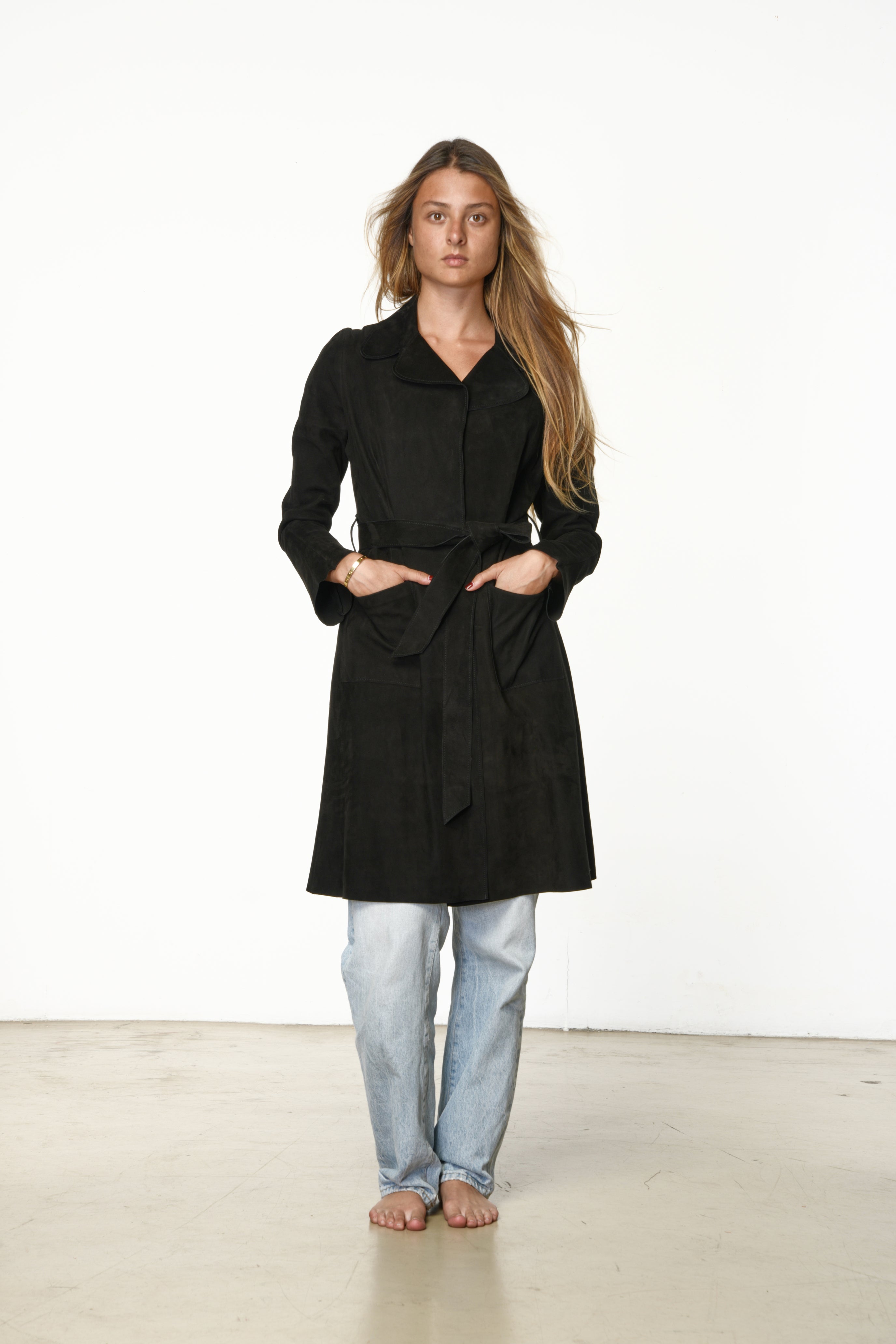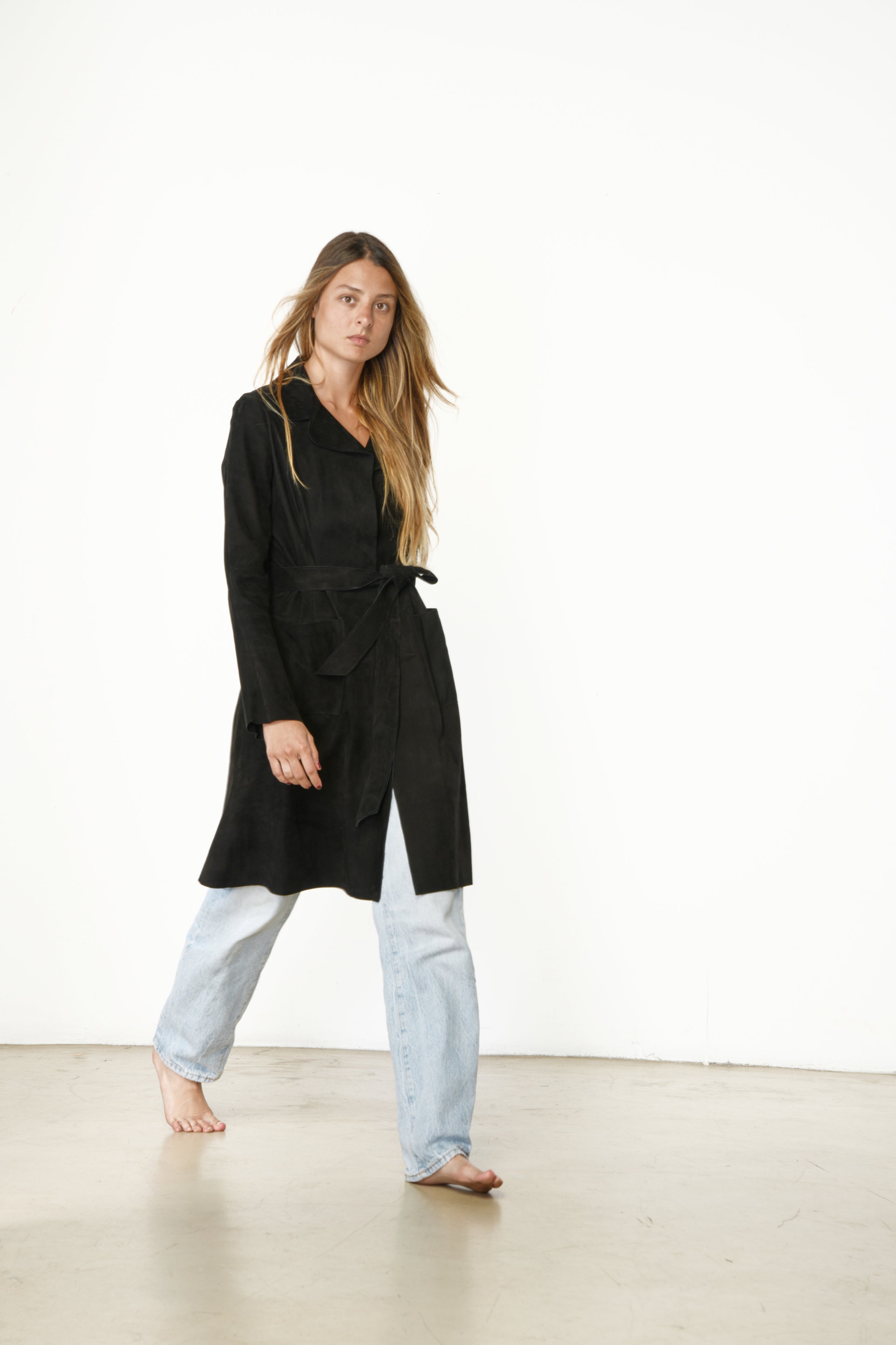 Short trench coat with waist belt. Essential, effortless, and bold.